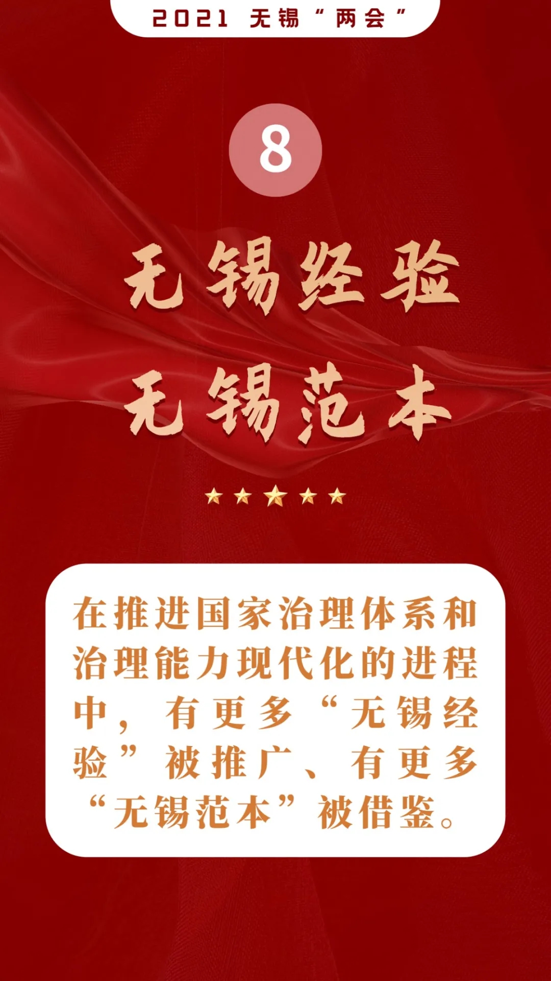 站在中國共產(chǎn)黨建黨一百周年光榮新起點上,勇做全省“爭當表率、爭做示范、走在前列”排頭兵,勇創(chuàng)全省“強富美高”示范區(qū),勇當全省高質(zhì)量發(fā)展領(lǐng)跑者,在現(xiàn)代化建設(shè)中體現(xiàn)無錫擔當、作出無錫示范、貢獻無錫力量,在國家強起來的歷史進程中烙下“太湖印記”。