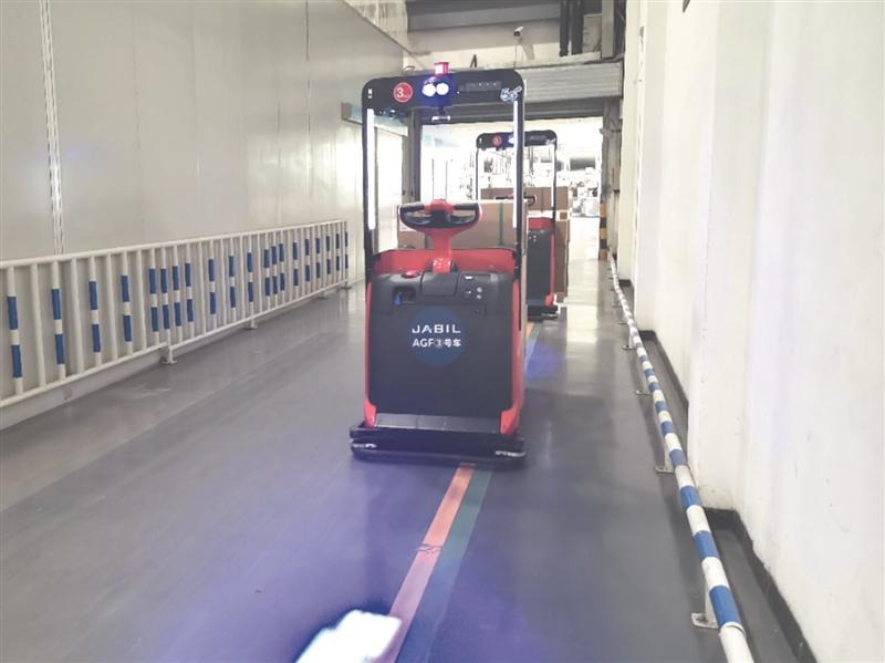 產(chǎn)品從生產(chǎn)線到運(yùn)送到倉庫,需要幾個(gè)人工搬運(yùn)?捷普電子(無錫)的回答是“0”。在江蘇無錫高新區(qū)的捷普電子(無錫)有限公司廠區(qū),記者看到,一輛橙黑色的“迷你運(yùn)送車”將生產(chǎn)線上打包好的產(chǎn)品搬運(yùn)到自己的“手臂”上,摞到一定高度后,自動(dòng)從生產(chǎn)車間“行走”到裝貨區(qū)域。若是碰到障礙物或者工作人員,它便自動(dòng)停下,等到行人離開后再按原定路線移動(dòng)。“智能運(yùn)送車會在成品區(qū)和出庫區(qū)之間來回接駁,既能實(shí)現(xiàn)成品先進(jìn)先出等智慧出庫,還能將大小、規(guī)格、包裝一致的標(biāo)準(zhǔn)件貨物自動(dòng)裝進(jìn)大貨車裝箱。”捷普電子(無錫)相關(guān)負(fù)責(zé)人介紹,如果車輛“不干活”,它們會自己主動(dòng)“吃飯”,到充電樁處給自己充電,等到下一個(gè)任務(wù)的到來。